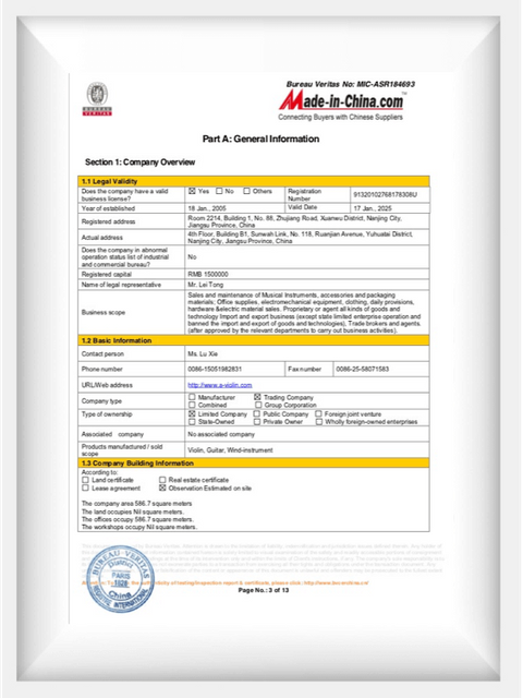 La Sra. Aileen Gu, fundadora de Aileen Music, comenzó su negocio de instrumentos musicales en 1993 y en 2005 se fundó Nanjing Aileen Trading Co., Ltd. Hasta ahora, Aileen Music ha ampliado su experiencia en el manejo de instrumentos musicales y ha aumentado su escala continuamente. Además, Aileen Music ha puesto muchos esfuerzos y recursos en el desarrollo e innovación de instrumentos. Tenemos cuatro apariciones y uso de patentes en instrumentos musicales. Hoy en día, Aileen Music se convierte en uno de los mayores y profesionales exportadores y mayoristas de instrumentos musicales y accesorios desde China hasta el extranjero.