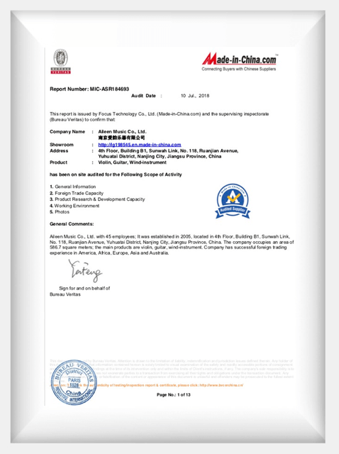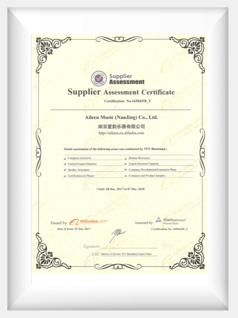 En 2012, Aileen Music obtuvo el\"Certificado de Sistema de Gestión de Calidad ISO9001\" y el\"Certificado de Evaluación de Comercio\" evaluado por Bureau Veritas Certification Greater China. En 2013, Aileen Music obtuvo el\"Certificado de evaluación de proveedores\" evaluado por Systems Tuv Rheinland Greater China. También lo hizo el\"Certificado de proveedor auditado\" evaluado por SGS-CSTC Standards Technical Services Co., Ltd.